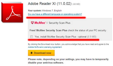 К сожалению, мы видим, что нам предлагают загрузить на английском и еще установить какую-то дополнительную программу. Нам нужен русский язык и ничего лишнего. Для этого, снимаем галочку с «Yes, install McAfee Security Scan Plus» и нажимаем на надпись «Do you have a different language or operating system?»