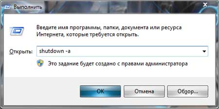 Если вы передумали это делать, то чтобы отменить автоматическое выключение необходимо успеть набрать команду в окошке «Выполнить»: shutdown -a.
