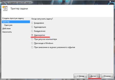 В следующем окошке указываем, что нашу задачу необходимо запускать однократно. Если хотите, чтобы ваш компьютер выключался ежедневно в одно и то же время, то можете поставить «Ежедневно».