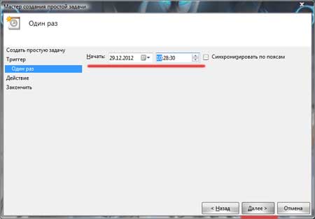 Ставим дату и время выполнения задания, то есть то время, когда вы хотите чтоб ваш компьютер сам по себе выключился. Опять жмем кнопочку «Далее».