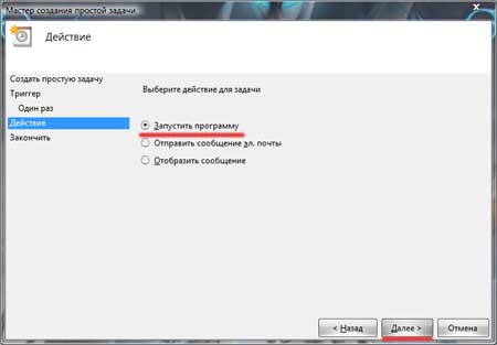 В следующем окошке ставим действие для задачи «Запустить программу»: