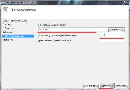 Далее в строчке программа или сценарий пишем shutdown, а в окошке «Добавить аргументы» ставим: -s -f .