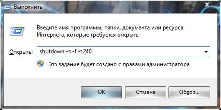 Данный способ довольно таки быстрый, единственный минус тут в том, что время, через которое необходимо выключить компьютер нужно указывать в секундах. Запускаем окошко выполнение заданий «Выполнить» при помощи сочетания клавиш Win+R и в открывшемся окошке пишем команду shutdown -s -f -t 240.