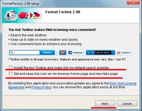 По ходу установки нам будет предложено установить поисковую службу «Ask» и ее панель закладок. В окошке «The Ask Toolbar makes Web browsing more convenient» снимаем галочки с «Install the Ask Toolbar and make Ask my default search provider» и «Set and keep Askcom as my browser home page and new tabs page». Жмем «Next»