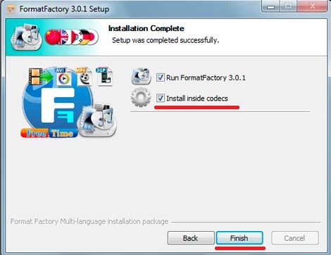 Когда появиться окошко «Installation Complete» галочки «Run FormatFactory» и «Install inside codecs» оставляем.