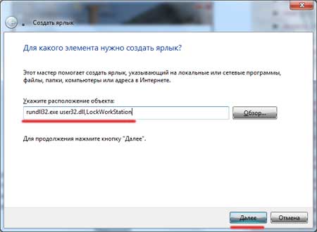 В поле «Укажите расположение объекта» вводим «rundll32.exe user32.dll,LockWorkStation». Жмем «Далее».