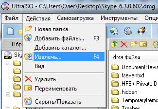 Теперь можно попробовать извлечь все содержание данного образа в какую-нибудь отдельную папку. Для этого жмем по вкладке «Действия» и из выпавшего меню выбираем «Извлечь».