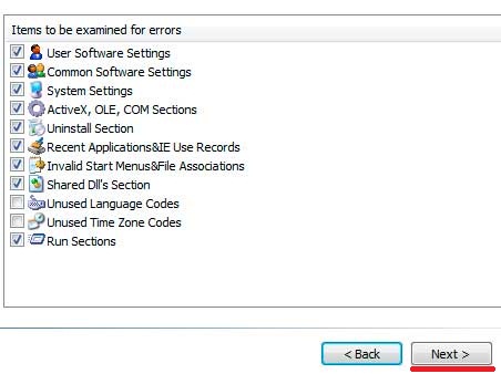 Далее идет список областей сканирования реестра, оставляем все по умолчанию, нажимаем «Next»