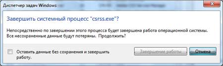Давайте теперь попробуем завершить данный процесс. Кликаем правой кнопкой мыши по нему и из выпавшего меню выбираем пункт «Завершить процесс». Нам выскакивает сообщение, что вместе с завершением данного процесса будет завершена и работа операционной системы, что еще раз доказывает важность процесса. Если бы это был обычный вирус, то подобное сообщение не выскакивало бы.