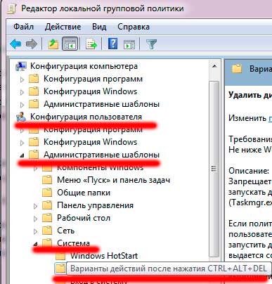 В левом столбике в «Конфигурация пользователя» раскрываем «Административные шаблоны» (не перепутайте с таким же пунктом в конфигурации компьютера), в них «Система» и нажимаем на пункт «Варианты действий после нажатия CTRL + ALT + DEL»
