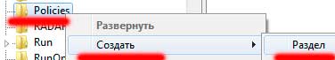 По умолчанию «Policies» пустой раздел, в нем ничего нет. Если вирус не постарался. Заходим в раздел «System», если таковой есть или создаем его, путем нажатия правой кнопки мышки на «Policies», «создать раздел» Называем его «System»