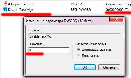 Имя ставим «DisableTaskMgr», значение «0»