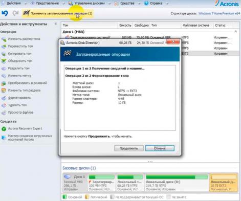 Диск еще не отформатирован. Там, где флажок жмем Применить запланированные операции, в высветившемся окне – Продолжить.
