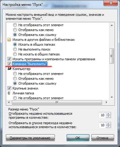 Ищем пункт «Команда «Выполнить»» и ставим напротив него птичку. Жмем кнопку «ОК».