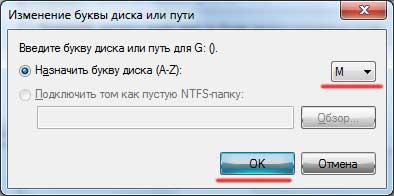 Далее в следующем окне, напротив «Назначить букву диска» выбираем из выпадающего списка необходимый нам символ и жмем на кнопку «ОК»: