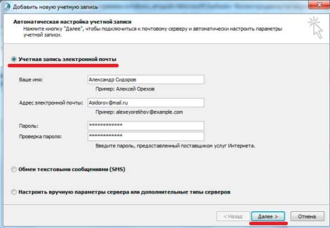 Высветиться простая форма, где вам нужно заполнить имя, адрес, вашей почты и пароль к ней, после чего нажать «далее»