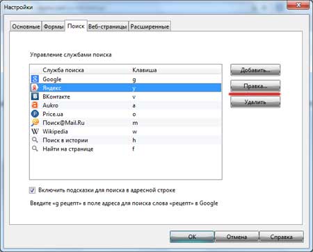 Если нужно сменить поисковую систему по умолчанию, например на Яндекс, то выделите ее и нажмите на кнопку «Правка».