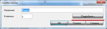 В следующем окошке мы можем изменить наименование поисковой системы и букву, которая ее вызывает, но в данном случае нас это не интересует и мы нажимаем на кнопку «Подробнее»