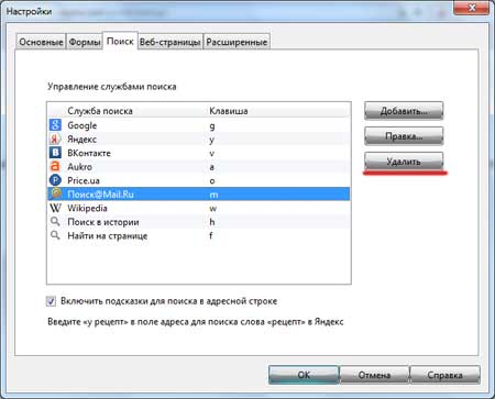 Для того, чтобы удалить из данного списка какую-нибудь поисковую систему, необходимо ее выделить и нажать на кнопку «Удалить».