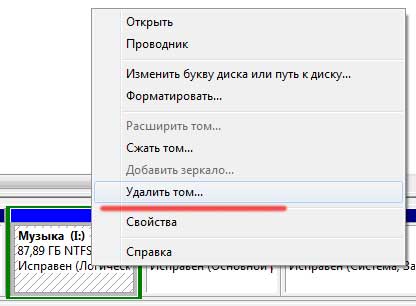 Кликаем правой кнопкой мыши по выбранному разделу и выбираем пункт «Удалить том».