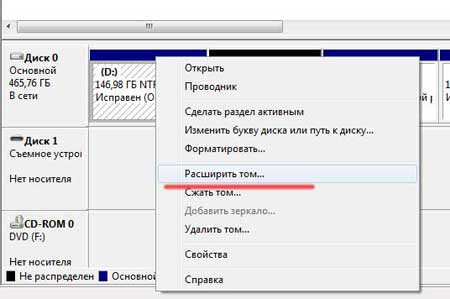 Далее выбираем том, который находится перед только что удаленным. Кликаем по нему правой кнопкой мыши и выбираем пункт «Расширить том…»