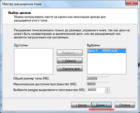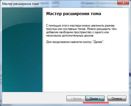 Открывается «Мастер расширения тома». Жмем кнопку «Далее».