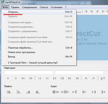 Теперь следите за стрелочками на скриншотах, если не знаете пока куда и что нажимать. Открываем необходимый нам музыкальный файл. Нажимаем «Файл «Открыть»».