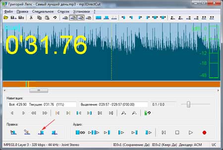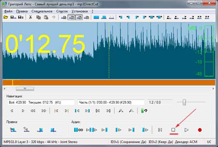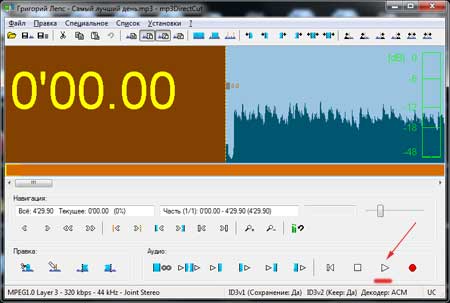 Ищем отрезок, который нам необходимо выделить и нажимаем на кнопку «Начало», далее тянем желтую полосочку до конца отрезка либо прослушиваем ее, опять нажимая на кнопку «Play».