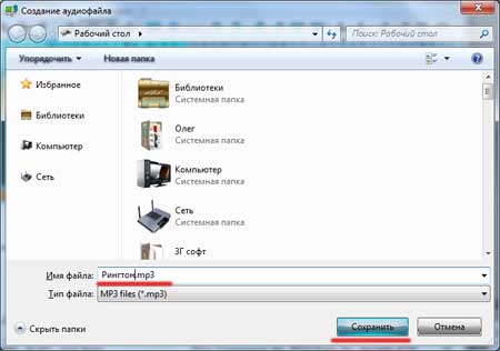 Вводим имя файла нашего будущего рингтона, указываем, куда сохранить файл и нажимаем «Сохранить».