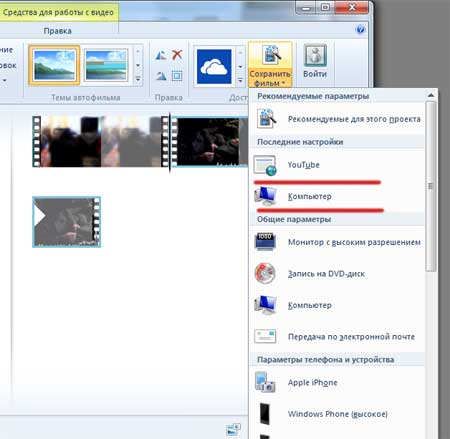 Осталось теперь только сохранить видеоролик. Для этого нажимаем на кнопку «Сохранить фильм». Из выпавшего меню можно выбрать либо «Компьютер» либо Youtube, чтобы ужать ролик.