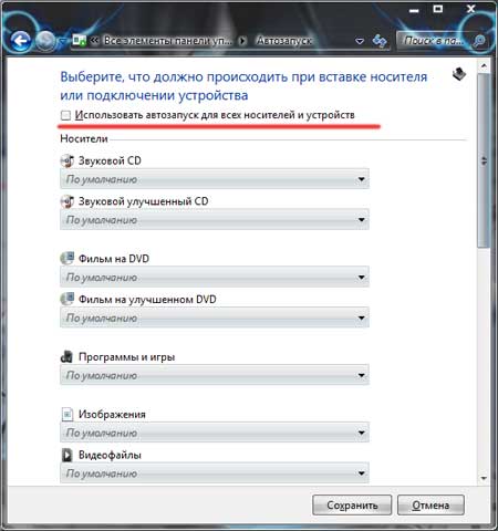 В следующем окошке нас просят выбрать, что будет происходить при вставке носителя или подключении устройства. Вверху стоит птичка возле пункта «Использовать автозапуск для всех носителей и устройств», ее необходимо убрать и нажать на кнопку «Сохранить».