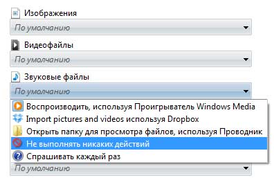 Например, для звуковых файлов я ставлю «Не выполнять никаких действий» и т.д.