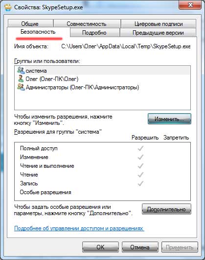 Создаем новый текстовый файл с названием SkypeSetup.exe. Кликаем по нему правой кнопкой мыши и выбираем пункт «Свойства». Переходим во вкладку «Безопасность» и нажимаем на кнопку «Изменить»: