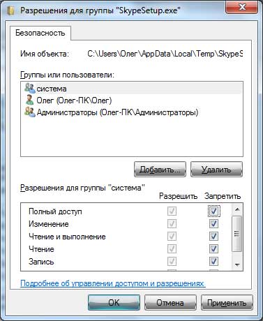 Можно также не удалять первоначальный файл SkypeSetup.exe, а попробовать зайти в его свойства и там запретить доступ всем пользователям.