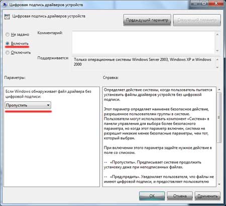 Теперь можно установить драйвер и проверка выполняться не будет и оборудование заработает. Однако работать оно будет только в данном режиме. Если загрузиться из-под обычного, то драйвер снова окажется неработоспособным.