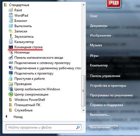 Заходим в командную строку: Пуск – Все программы – Стандартные – Командная строка: