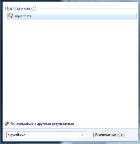 Нажмите кнопку «Пуск» и в строке поиска введите sigverif.exe, кликните по результату: