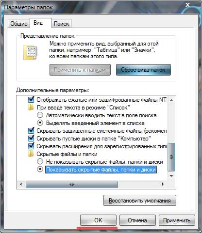 В открывшемся окне переходим во вкладку «Вид» и ставим переключатель в пункт «Показывать скрытые файлы, папки и диски». Все, жмем «ОК».