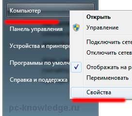 Итак, приступим. Проще всего посмотреть основное, это взглянуть в свойства «моего компьютера» (читайте далее, если не можете его найти). В разных версиях картинка немного отличается, но принцип один и тот же. Нажимаем «пуск», на значке «компьютер», жмем «свойства». Или же проще, это нажать комбинацию клавиш «win+pause»