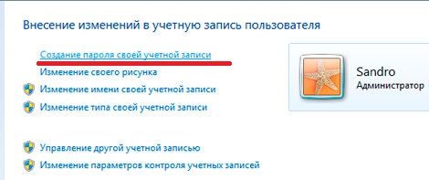В открывшимся окне выбираем строчку «Создание пароля своей учетной записи»
