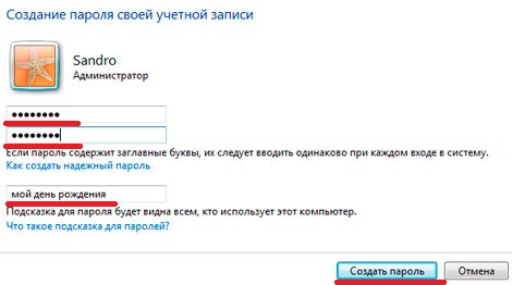 В первой строчке вводим придуманный пароль, во второй вводим его еще раз, в третей вводим подсказку для пароля, которую будут видеть все. Можно наоборот сбить столку, главное самому не забыть пароль!