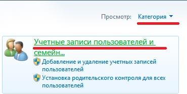 Выбираем «Просмотр: категория» жмем на «Учетные записи пользователей…»