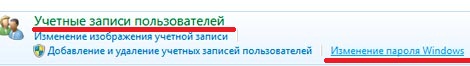 В появившемся окне в категории «Учетные записи пользователей» видим подпункт «Изменение пароля Windows», нажимаем туда. Жмем «Создание пароля…» как написано в статье немного выше.