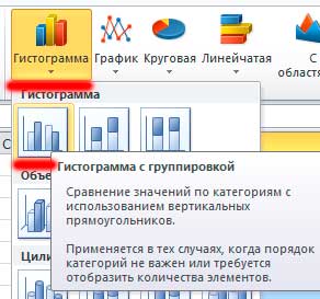 Тут их множество разновидностей, при наведении, высвечивается подсказка. Выбираем самый простой вариант «Гистограмма с группировкой».