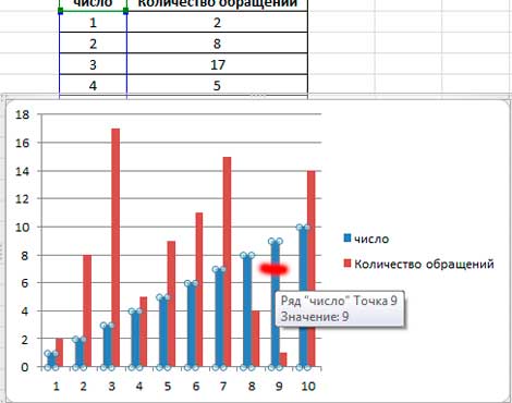 Построенную диаграмму мы можем перемещать в любой удобный уголок листа Microsoft Excel. Также можете ее растягивать и суживать. Также мы видим, что по умолчанию диаграмма построилась на числа и на обращения. Нам нужно убрать лишнее. Для этого, просто выделяем ненужные значения, нажав на них левой кнопкой мышки и жмем «Del»
