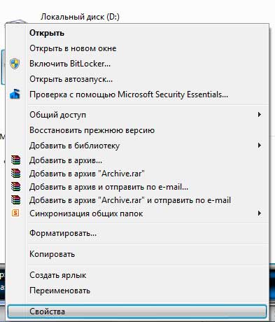 Открываем «Мой компьютер», смотрим на разделы жесткого диска и кликаем правой кнопкой мыши по тому разделу, который необходимо проверить и выбираем пункт «Свойства».