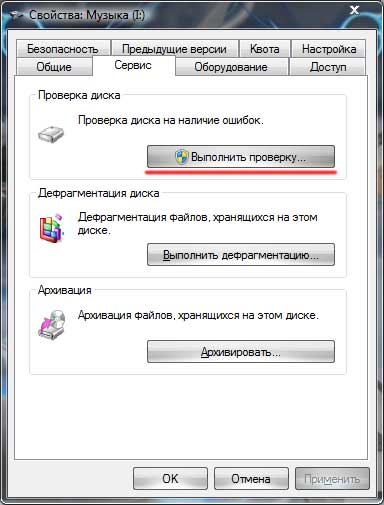 У нас открывается окошко под названием «Свойства», переходим во вкладку «Сервис» и нажимаем на кнопку «Выполнить проверку».