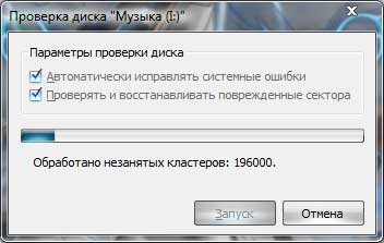В следующем окошке указываем параметры проверки диска, ставим птички напротив пунктов «Автоматически исправлять системные ошибки» и «Проверять и восстанавливать поврежденные сектора». После этого нажимаем на кнопку «Запуск».