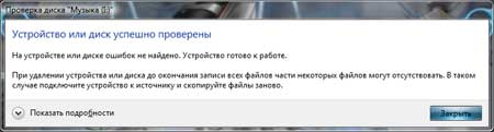 Спустя некоторое время проверка диска закончится и вам выдастся следующее окошко с сообщением о состоянии раздела вашего жесткого диска: «Устройство или диск успешно проверены».