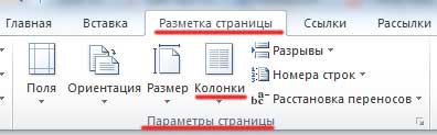 Переходим во вкладку «Разметка страницы», ищем раздел «Параметры страницы» и обращаем внимание на пункт «Колонки»: